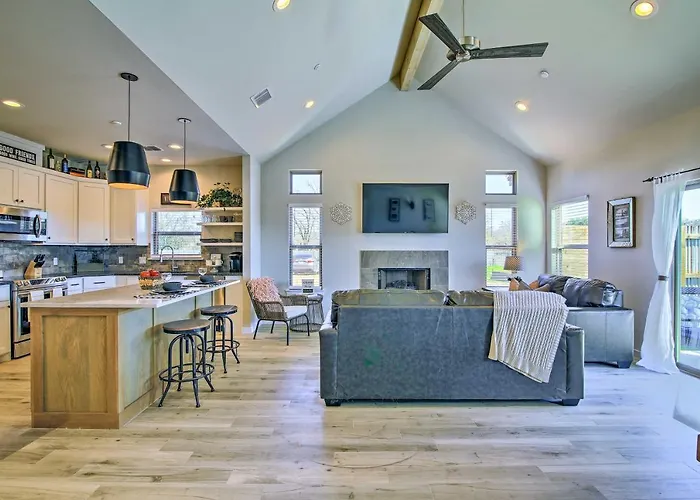 Nestled less than a mile from Fredericksburg's vibrant Main Street, the Uncorked Ranch Hill Country Home serves as an ideal refuge for those eager to explore the picturesque Texas Hill Country. This family-friendly abode combines modern conveniences with Texas charm, making it the perfect hideaway for couples or family gatherings seeking to indulge in local wineries and outdoor adventures. With its sunny interiors adorned with Lone Star State decor, guests can unwind in comfort while enjoying beautiful garden views from the private patio.